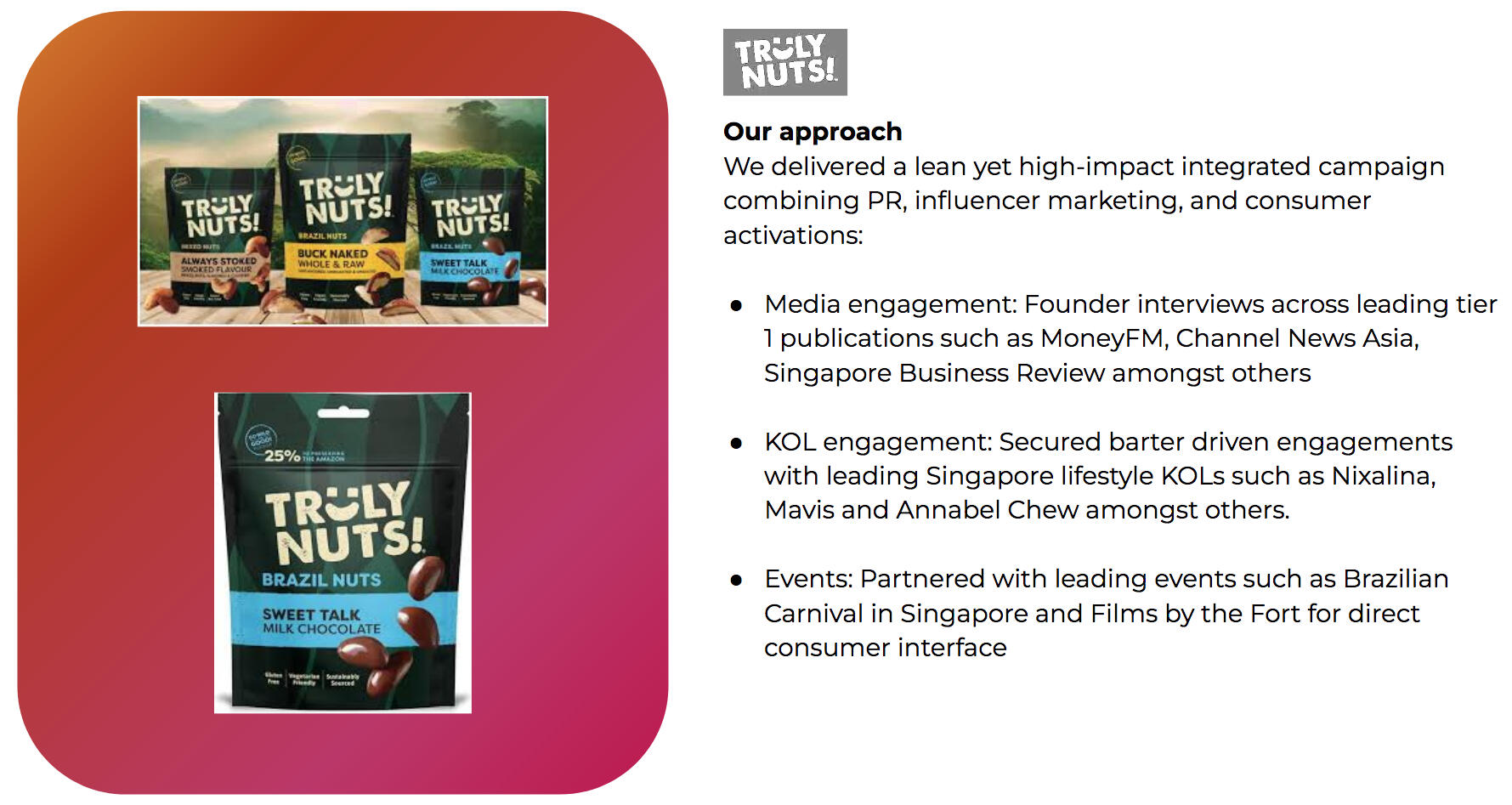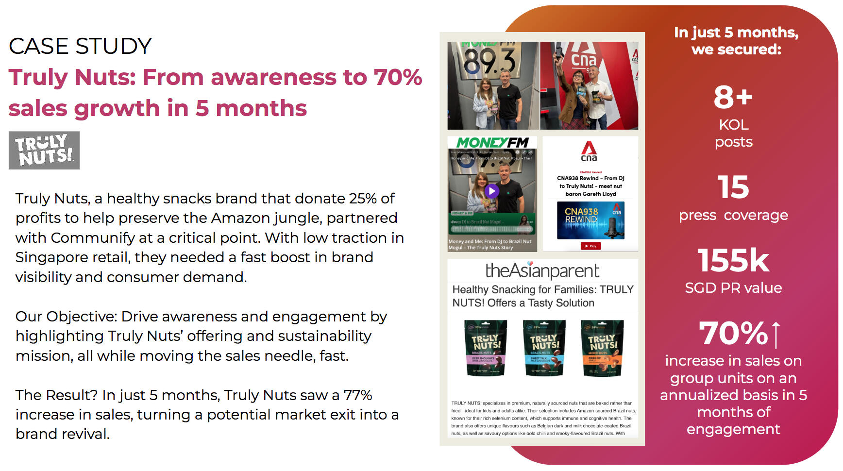 Truly Nuts, a healthy snacks brand that donate 25% of profits to help preserve the Amazon jungle, partnered with Communify at a critical point. With low traction in Singapore retail, they needed a fast boost in brand visibility and consumer demand.Goal