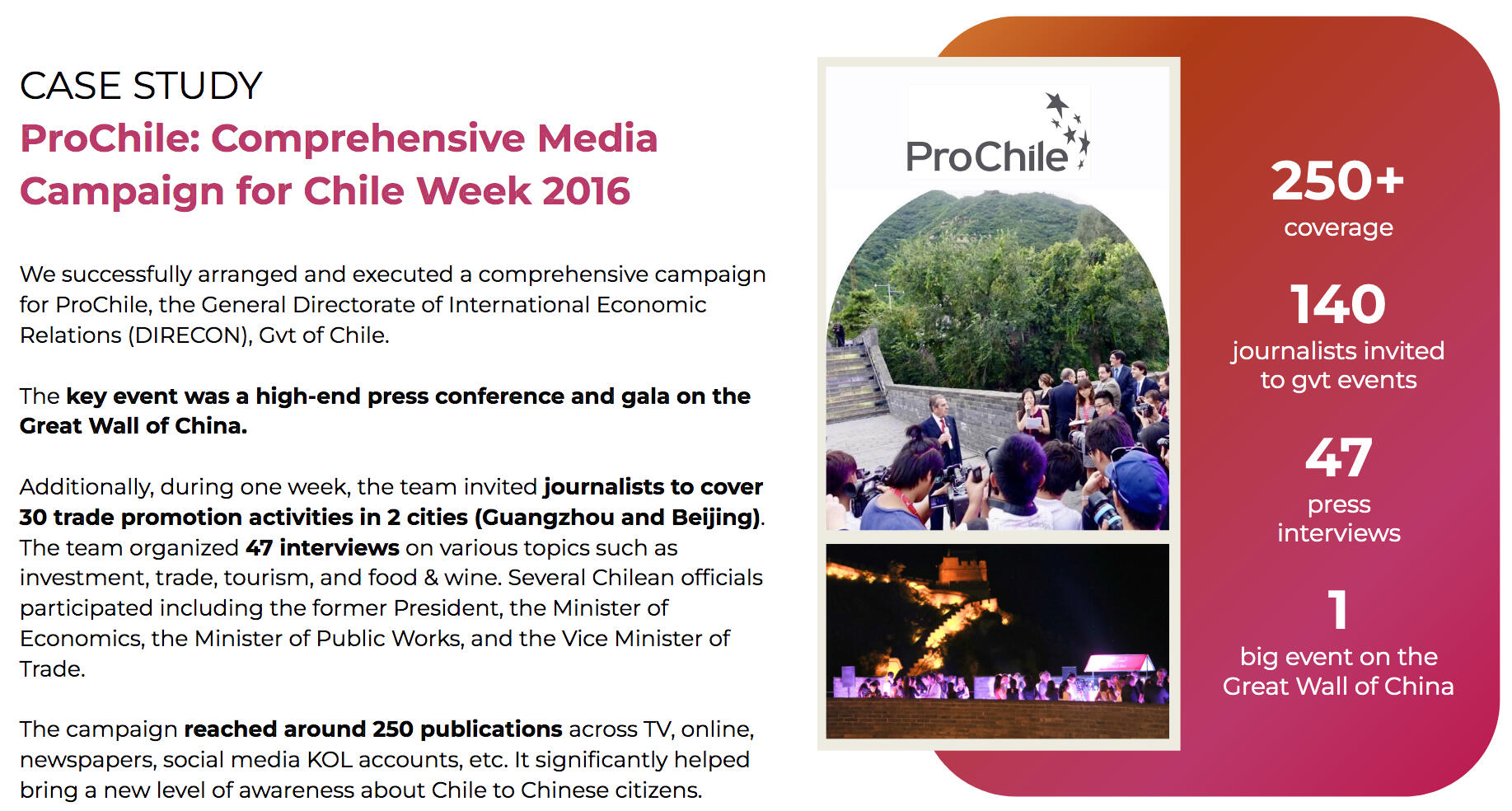 We successfully arranged and executed a comprehensive campaign for ProChile, the General Directorate of International Economic Relations (DIRECON), Gvt of Chile.The key event was a high-end press conference and gala on the Great Wall of China.Additionally, during one week, the team invited journalists to cover 30 trade promotion activities in 2 cities (Guangzhou and Beijing). The team organized 47 interviews on various topics such as investment, trade, tourism, and food & wine. Several Chilean officials participated including the former President, the Minister of Economics, the Minister of Public Works, and the Vice Minister of Trade.The campaign reached around 250 publications across TV, online, newspapers, social media KOL accounts, etc. It significantly helped bring a new level of awareness about Chile to Chinese citizens.